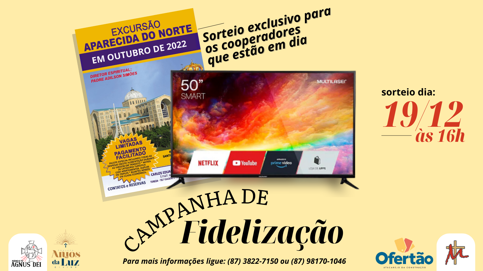 Para você que é um cooperador fiel, estamos realizando este incrível sorteio de uma TV 50″ polegadas, um IPhone Apple 8 e uma Excursão para Aparecida do Norte com Pe. Adilson.